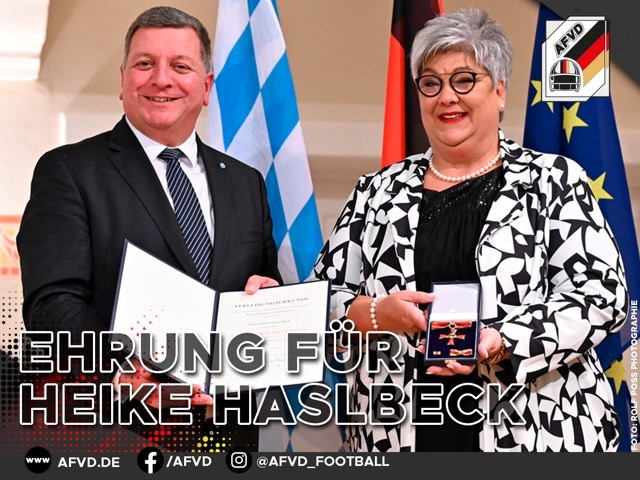 Am vergangenen Wochenende gab es für ein Präsidiumsmitglied des AFVBy eine ganz besondere Auszeichnung. Heike Haslbeck erhielt in Landshut das Bundesverdienstkreuz der Bundesrepublik Deutschland, für ihr Engagement im American Football und Cheerleading in Deutschland. Bereits 1984 hat Frau Heike Haslbeck im American Football im Verein in Straubing begonnen und hat dann 1993 ehrenamtlich als Vizepräsidentin im American […]