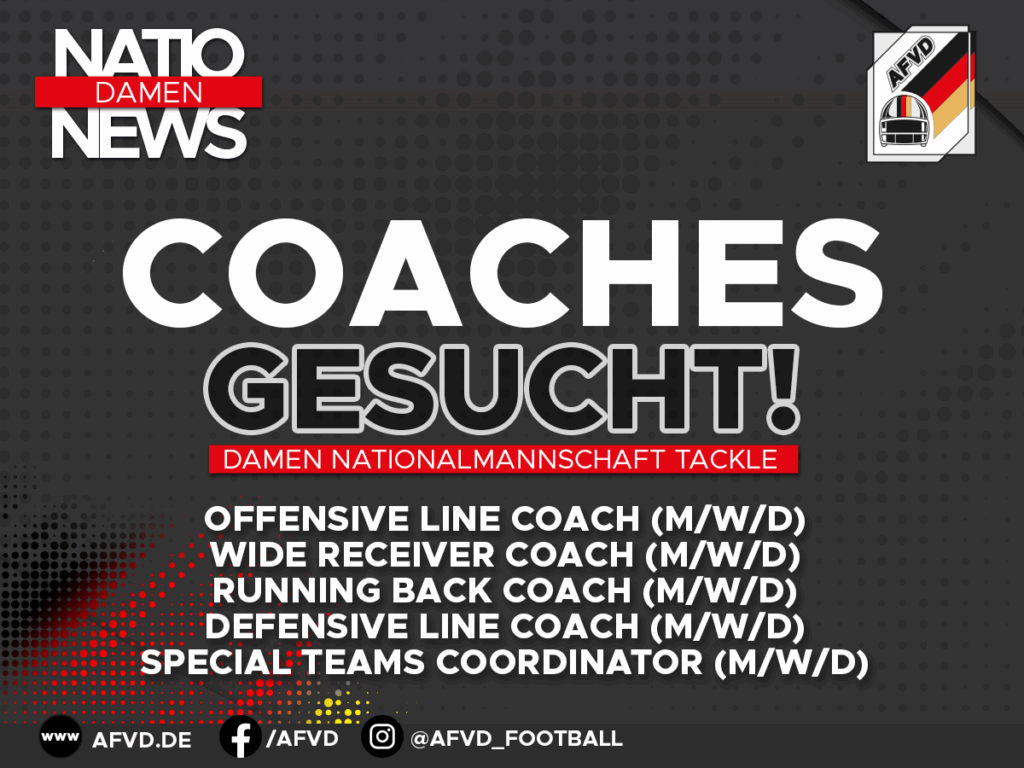 Weitere Coaches für die Damen-Nationalmannschaft gesucht Neulich haben wir die Ernennung von Damen Headcoach Nicole Manthey bekanntgeben können, sie wird von den beiden bewährten Coordinatoren Matthias Preßler (Mainz Golden Eagles) und Imke Steinmöller (Berlin Kobra Ladies) unterstützt. Jetzt werden vier weitere Position Coaches und ein Special Teams Coordinator gesucht, die Stellen sind ab sofort ausgeschrieben, […]