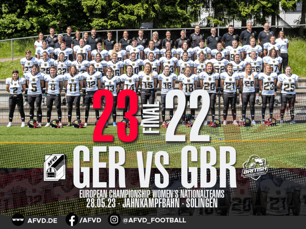 Am Sonntag, den 28.05.2023 erwartet die deutsche Frauen Nationalmannschaft in Solingen die Vizeweltmeister aus Großbritannien zum Auftakt der Europameisterschafts-Länderspielserie. Kickoff ist um 14:00 Uhr, Einlass ab 13:00 Uhr. Die Solingen Paladins sorgen für das Catering, Cheerleader und live gesungene Nationalhymnen für das passende Rahmenprogramm. Kinder bis 6 Jahre haben freien Eintritt, Tickets für Schüler und […]