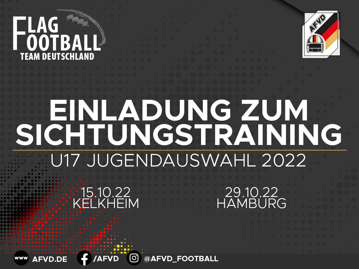 Das erste Sichtungstraining wird am 15.10.2022 in Kelkheim von den Lizzards veranstaltet, das Zweite am 29.10.2022 in Hamburg von den Blue Devils. Geladen sind Mädchen der Jahrgänge 2006 bis 2009 und Jungen der Jahrgänge 2006 bis 2008.