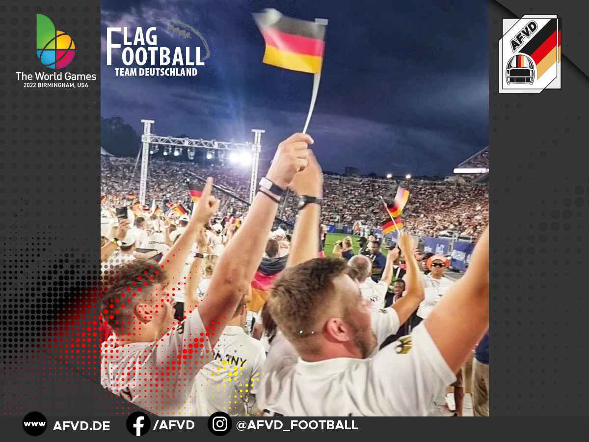 Die Mühen der Reise haben sich mehr als gelohnt. Die Athleten der deutsche Flag Football Nationalmannschaft erlebten bei der glanzvollen, gigantischen und abwechslungsreichen Eröffnungsfeier der WorldGames2022 einen Gänsehautmoment nach dem anderen.