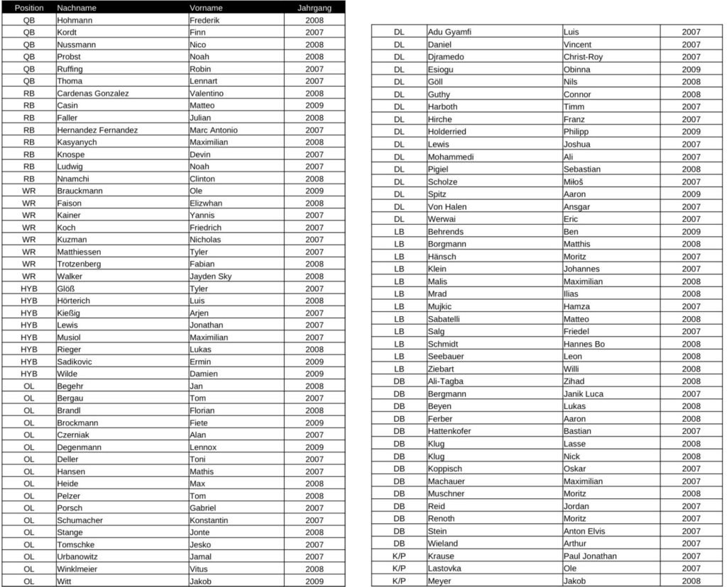 - Erweiterter Kader (weitere 30 Spieler) : Als breite und nachhaltige Basis über die gesamte Saison hinweg. Die Spieler dieser Gruppe nehmen derzeit nicht an Maßnahmen teil, können jedoch bei Ausfällen oder Veränderungen im Saisonverlauf kurzfristig berücksichtigt werden.