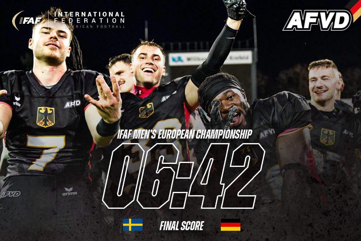 Im letzten Quarter belohnt sich die starke deutsche Defense selbst mit einem Touchdown durch ihr Linebacker Duo. Erst verursacht Tim Unger mit einem harten Tackle einen Fumble, dann reagiert Luis Bach am schnellsten und bringt das Ei in die Endzone, 42:0, PAT Schlomm. In der Schlussphase bringen die Schweden dann mit einem Touchdownpass von Quarterback Viktor Wessberg ihre ersten Punkte auf die Anzeigentafel, der PAT wird von Deutschlands Defense geblockt und es steht 42:6. Durch Läufe von Leon Helm bewegt sich Team Germany noch einmal Richtung schwedischer Endzone, lässt dann aber das Spiel in der Victory Formation ausklingen – und sich danach im Flutlicht des Grotenburg Stadions gebührend feiern.