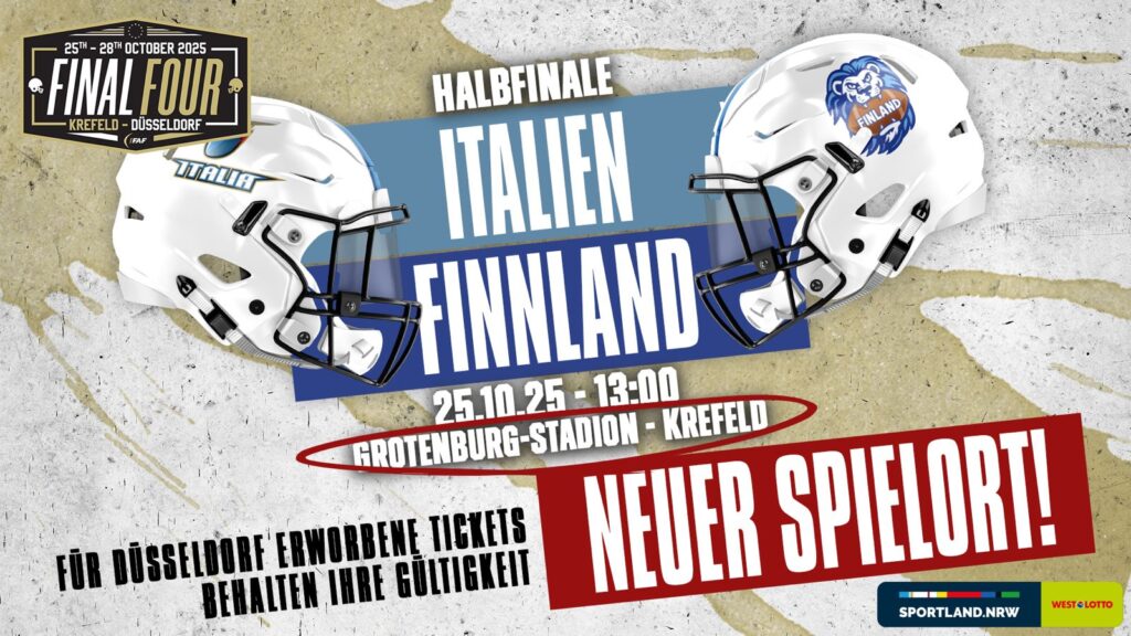 Beim Final Four der American Football Europameisterschaft gibt es eine Änderung der Spielstätte. Aufgrund internationaler, sicherheitsrelevanter Vorgaben wird das Spiel zwischen Finnland und Italien am Samstag, den 25. Oktober 2025 von Düsseldorf nach Krefeld verlegt. Der Kickoff bleibt um 13:00 Uhr unverändert und alle bereits für Düsseldorf gekauften Eintrittskarten behalten auch für Krefeld ihre Gültigkeit. […]
